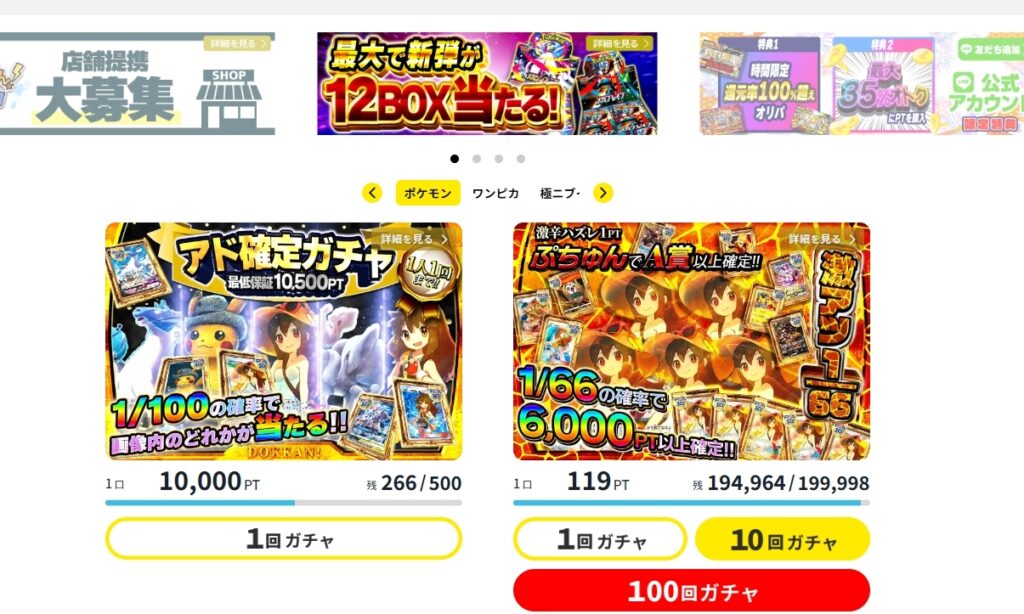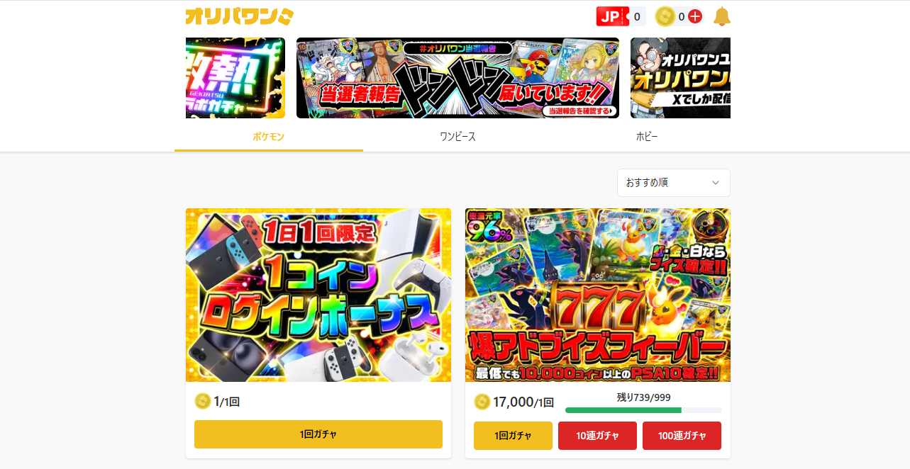 オリパの特徴としては、1円から回すことができる「1円オリパ」や、回せばかならず支払いPtよりアドになる「アド確定オリパ」が用意されています。