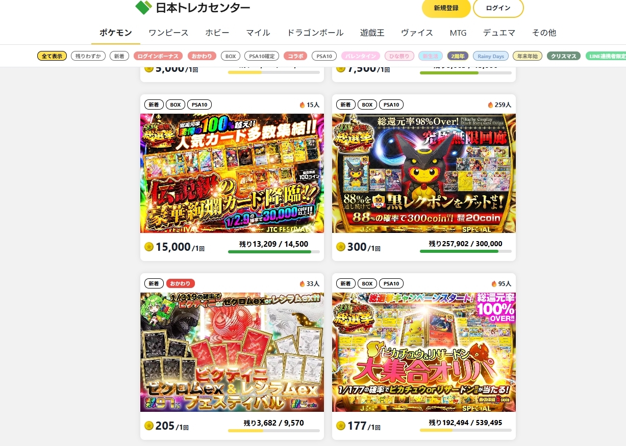 日本トレカセンターは、PSA認定10のレアカードを始め、かなり豊富な種類のカードを取り扱っているオンラインオリパです。