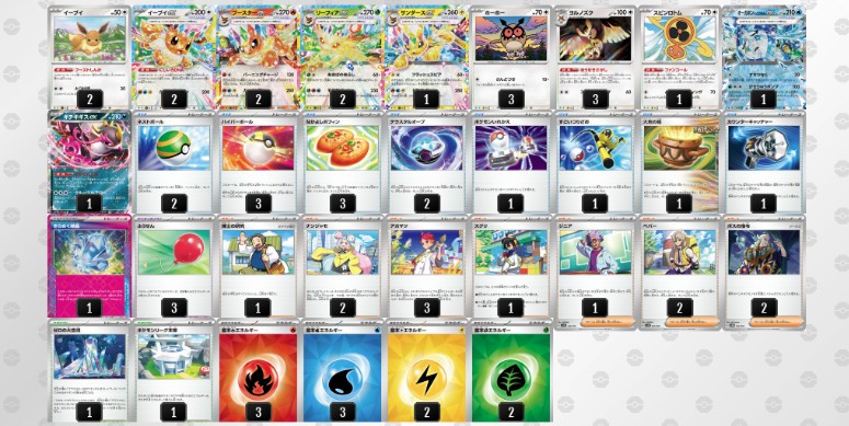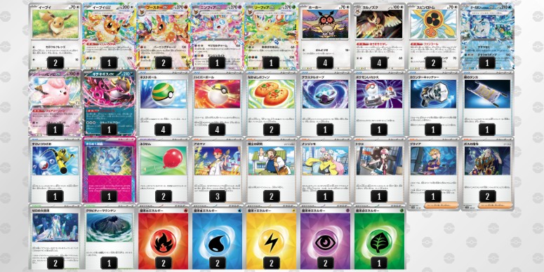 1つ目のデッキでご紹介したブースターexとリーフィアexに加え、ニンフィアexも採用したデッキとなっています。