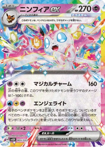 ニンフィアexのワザ「マジカルチャーム」は、相手のバトルポケモンに130ダメージと、次の相手の番、「マジカルチャーム」を受けたポケモンが使うワザのダメージは「-100」されるため、火力を低くすることができます。