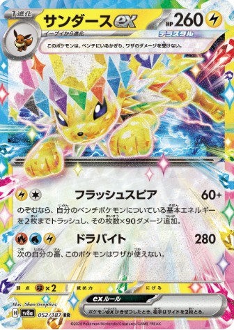 サンダースexのワザ「フラッシュスピア」は、相手のバトルポケモンに60ダメージ与え、のぞむなら自分のベンチポケモンについている基本エネルギーを2枚までトラッシュし、その枚数×90ダメージ追加することが可能です。