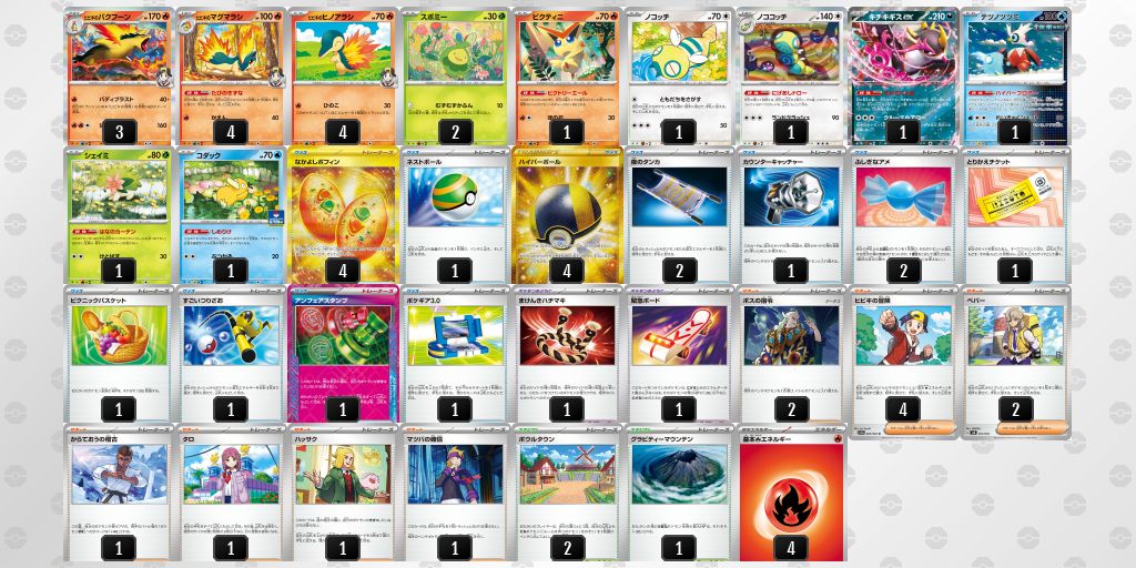 シティリーグを勝ち抜いた「マシマシラ」採用型のヒビキのバクフーンデッキです。