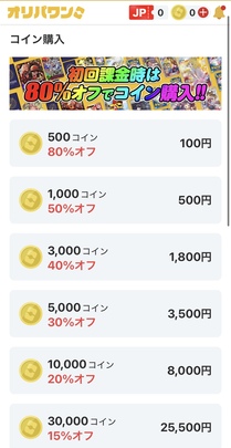 オリパワンでは、コイン初回購入時に80%オフで購入できるクーポンが配布されています。