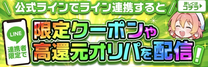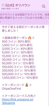オリパワンではLINE友だち登録を行うと、コインを最大80%オフで購入できるクーポンが獲得できます。