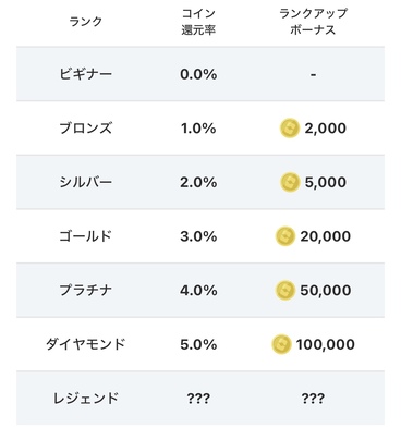 ランクが上がるとコインの購入時還元率がアップする他に、ランク限定のガチャ、ランクアップ時にはボーナスコインを獲得可能です。