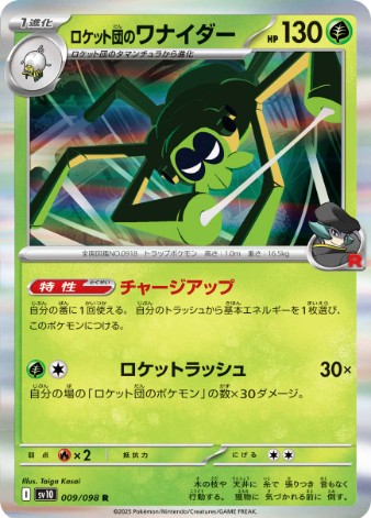 ロケット団のワナイダーの特性「チャージアップ」は、自分のトラッシュから基本エネルギーを1枚選び、自身に付けることができます。